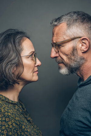 Two human figures stand back to back, one in shadow and the other illuminated. The contrasting sides highlight their unique features and expressions in a visually striking manner.