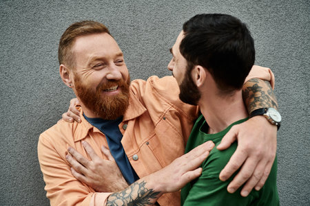 A portrait of a gay couple in love, wearing casual attire, embracing each other in front of a grey wall.