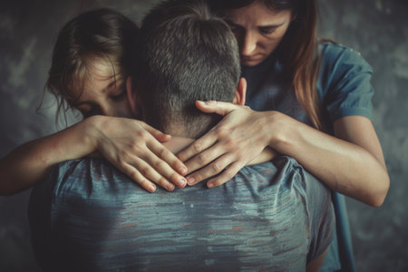 Two individuals embrace tightly in a moment of silent communication, expressing profound emotions without words in a softly blurred environment.