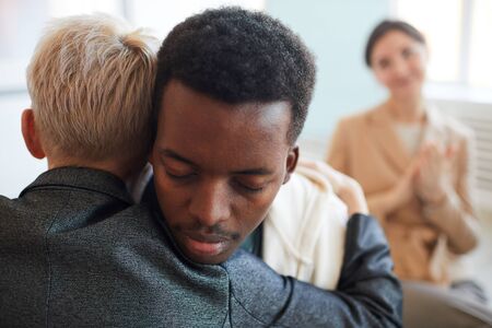 Young man giving hug to female against African American patients standing in embrace while attending course of psychological help