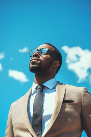 A black businessman stands outside, wearing a suit and sunglasses. He looks up at the blue sky filled with clouds. It is a bright and sunny day.