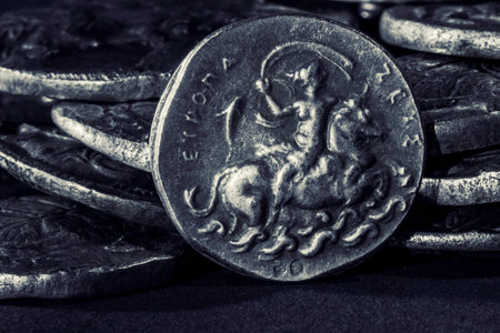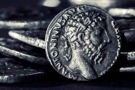 Pile of ancient silver coins with portraits, close-up macro shot, selective focus