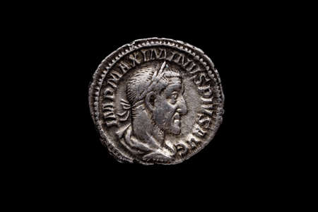 Roman coin, AR Denarius,Maximinus, Rome mint, 236-238 AD., ,Ancient roman coin with portrait of emperor isolated on black