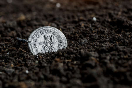 Ancient coin of the Roman Empire.Authentic silver denarius, antoninianus of ancient Rome.Roman silver coins covered in dirt.Antikvariat.