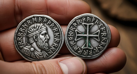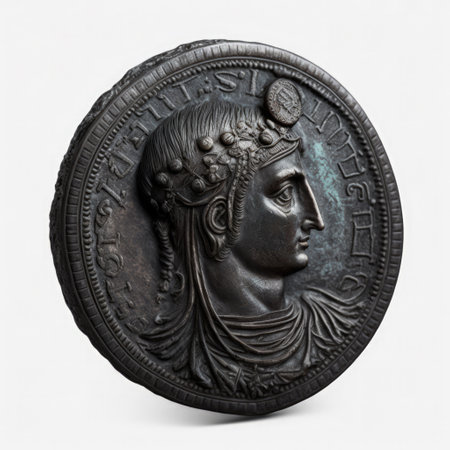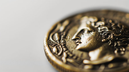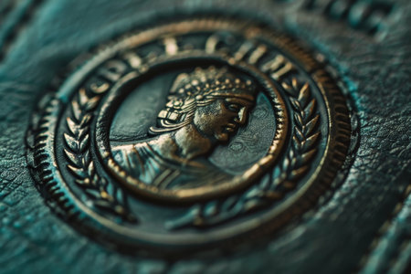 A beautifully engraved coin reveals a regal figure, showcasing intricate designs and textures. Soft light illuminates the metallic surface, highlighting artistry and historical significance.