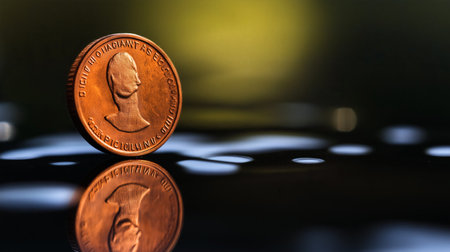 A close-up shot of a copper coin reflecting on a dark surface, showcasing its detailed face and edge in a beautifully lit setting