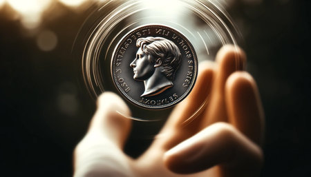 A single golden dollar coin flipping mid-air, captured in sharp detail with a blurred background.