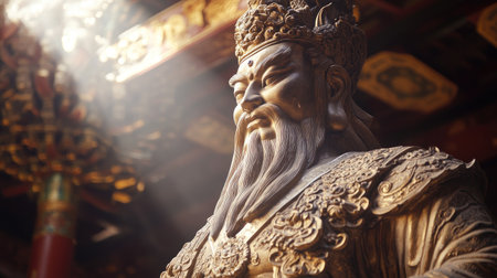 A majestic statue of the God of Fortune with intricate details illuminated by gentle light