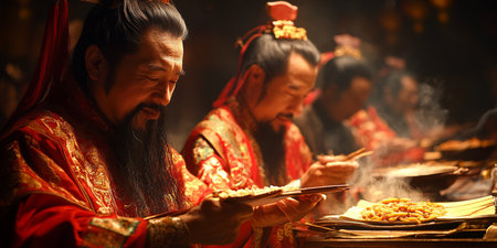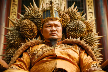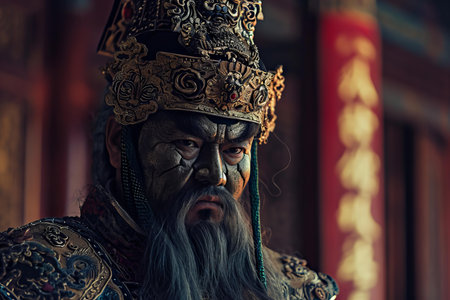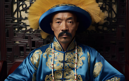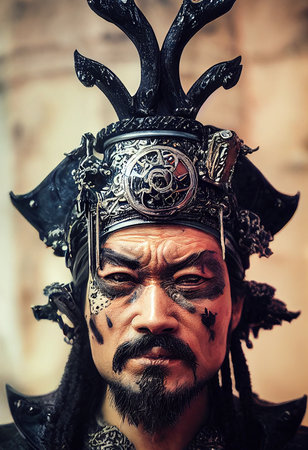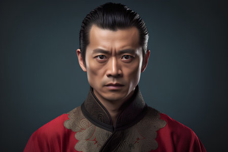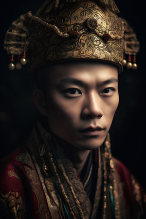 An Asian man dressed as an ancient Chinese emperor. A serious Chinese ancient ruler. 3D render