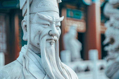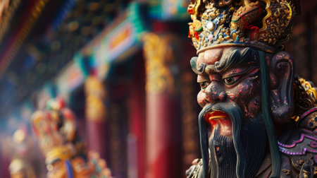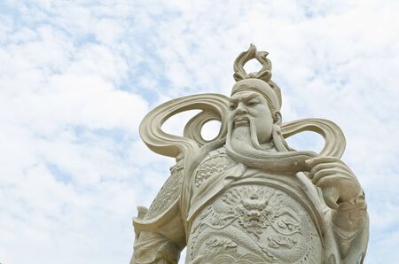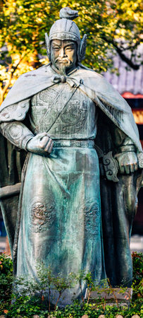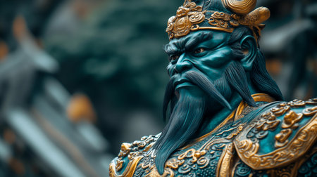 Detailed closeup of a traditional chinese warrior statue with a serene background