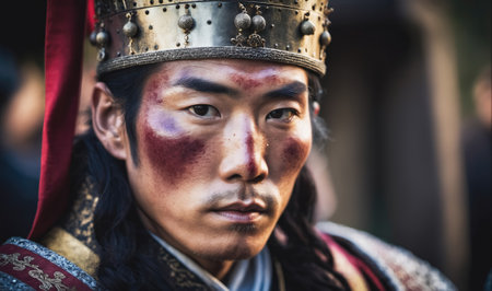 Traditional costumes, cultural festival, vibrant colors, heritage celebration, Asian cultural attire, ornate decorations, face paint, historical significance in a festive setting