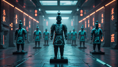 Futuristic terracotta warriors standing in formation in a dark corridor illuminated by neon lights, showcasing a blend of ancient history and futuristic technology. Ai generated image