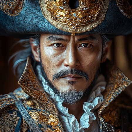A mesmerizing portrait of a man in a traditional ancient Chinese costume, featuring intricate embroidery and a vibrant hat, showcasing cultural heritage.