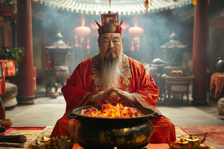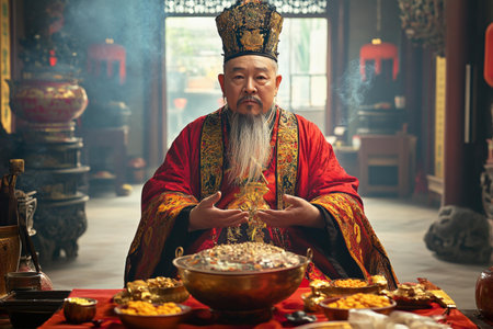 Portrait of a senior Chinese man in traditional clothes in a temple