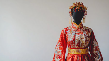 This image features a stunning traditional Chinese dress in vibrant red, displayed on a mannequin, showcasing its intricate embroidery and decorative headdress in an artistic setting.