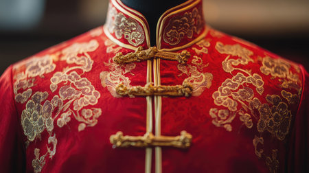 This striking red traditional Chinese garment features exquisite gold embroidery, celebrating rich cultural heritage. Perfect for showcasing unique fashion aesthetics and artistry.