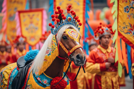 Chinese zodiac horse dressed in a traditional parade costume, surrounded by colorful decorations and festive elements, during Chinese New Year celebrations.