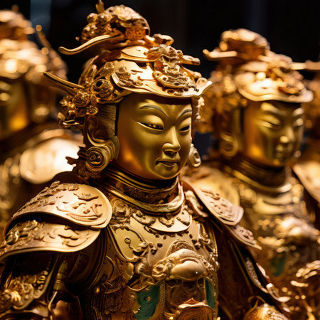 Ancient bronze statues of Japanese warriors. Selective focus.