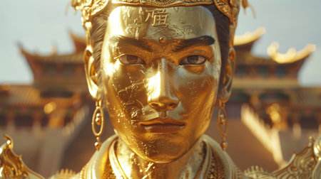 Golden Statue, Luxurious Palace, Symbol of power in a civilization centered around gold trade, vibrant ceremonies, majestic architecture, overcast weather, 3D render, backlighting