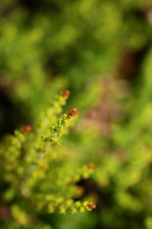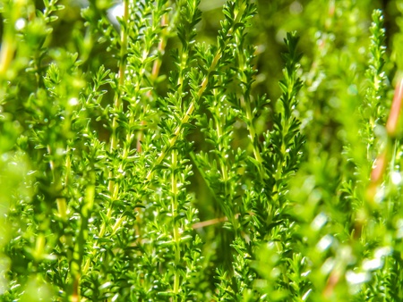 new sprouts of heather in the garden backlit
