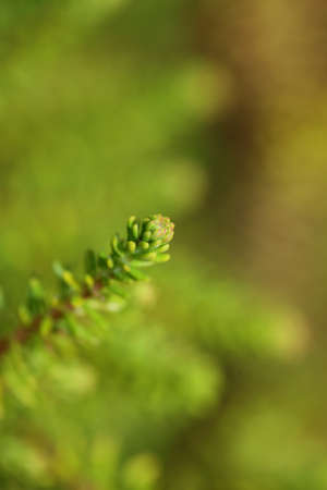 Close up of evergreen tree in the garden. Natural background.