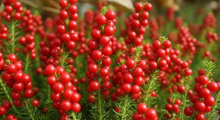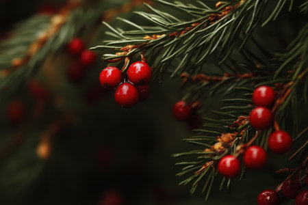 Bright red berries cling to lush green evergreen branches capturing a serene moment in nature during the winter season.