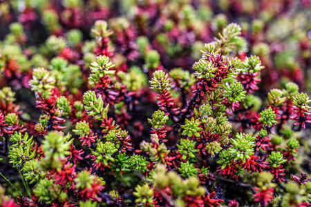 Sedum rubrotinctum green plant in garden, spring time, Iceland