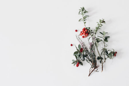 Fall floral composition. Blooming purple heather branch and lingonberry with red berries isolated on white table background. Healthy mountain cranberry fruit. Wild autumn plants. Herbal bouquet.