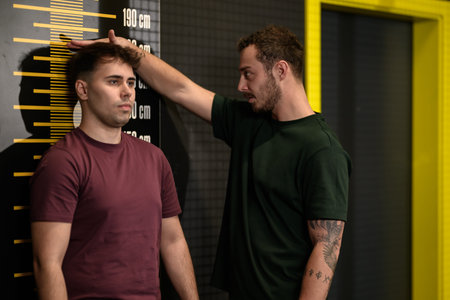 Two men measuring height at a fitness center with a height chart on the wall during a training session in the afternoon