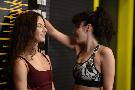 Two women stand together in a gym while one measures her height against the wall marked with measurement lines in an indoor fitness area