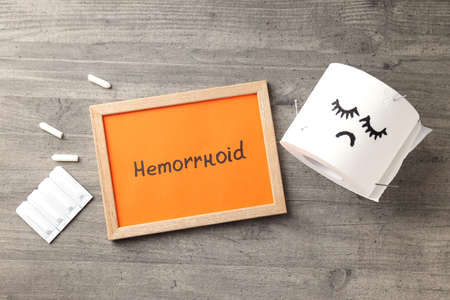 Concept of healthcare with hemorrhoids accessories on gray textured background