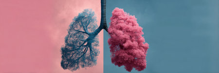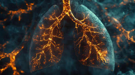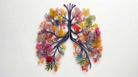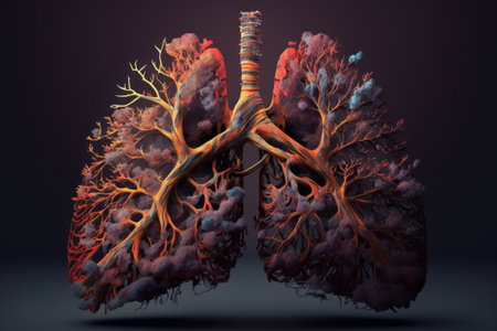 An artistic visualization features a pair of human lungs, with elaborate branching structures resembling trees. This imaginative depiction highlights the intricately anatomical details and textures