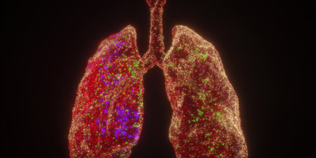 Digital 3d lungs with glowing green and purple particles highlighting anatomy and infection, illustrating respiratory disease, pathology, medical research and diagnostic imaging