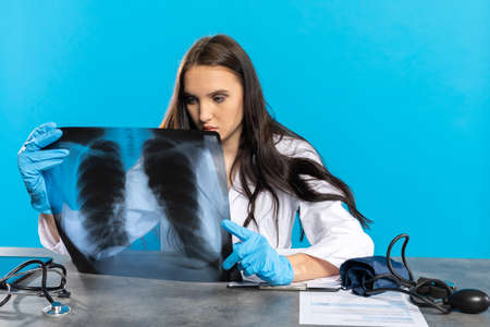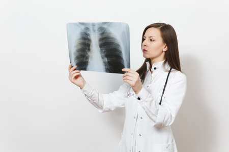 Perplexed focused doctor woman with X-ray of lungs, fluorography, roentgen isolated on white background. Female doctor in medical gown stethoscope.
