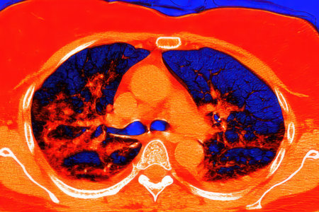 Human lungs with COVID-19 pneumonia, color-enhanced CT scan showing normal lung tissue in dark blue and affected bilateral areas with ground-glass opacities and crazy-paving patterns in red.