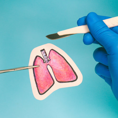 gloved surgeon holds scalpel and clamp. Drawing of human lungs on surgical table. Blue background. concept of operation. square image