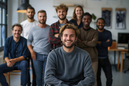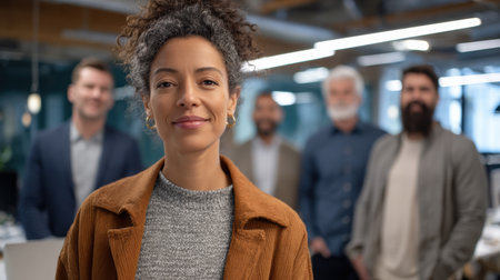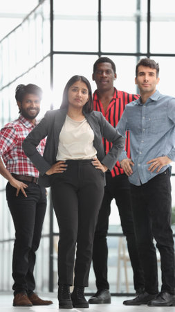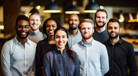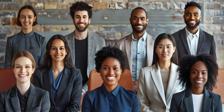 A diverse group of professionals stands confidently in an office environment, dressed in business attire. High quality photo