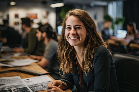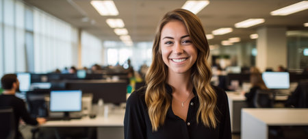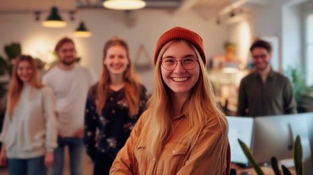 Portrait of smiling businesswoman at office with colleagues in background