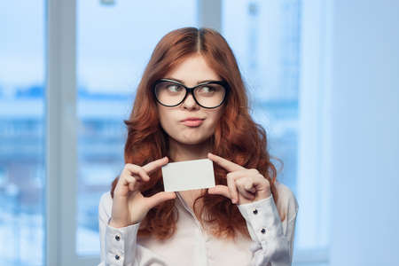 cheerful red-haired woman with a business card in her hands Office Copy Space manager