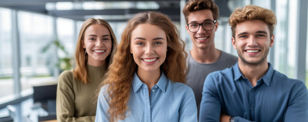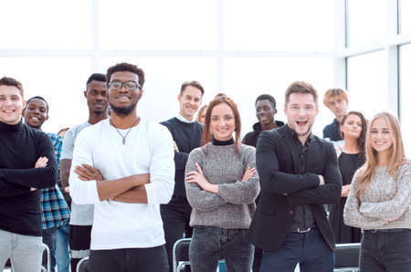 group of confident young people standing in a conference room