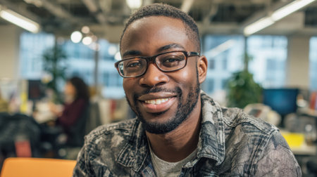 A young man wearing glasses smiles warmly at the camera in a vibrant office setting. Natural light fills the room enhancing the positive atmosphere as colleagues work nearby.