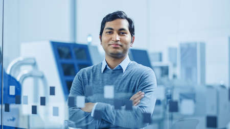 Modern Factory Office: Portrait of Handsome Indian Engineer Crosses Arms and Smiles Charmingly. In the Background High Tech Facility with CNC Machinery, Robot Arm and People Working