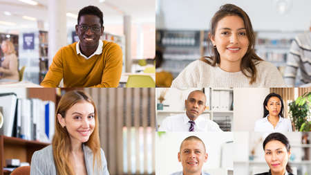 Collage or mosaic of diverse ethnicity young people group headshots, smiling multicultural people looking at camera, during video conference, meeting from home during quarantine. High quality photo