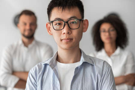 Smart ethnic man looking at camera against diverse colleagues during work