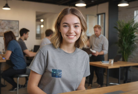 Young professional in a casual shirt at the office. Approachable and relaxed work atmosphere.