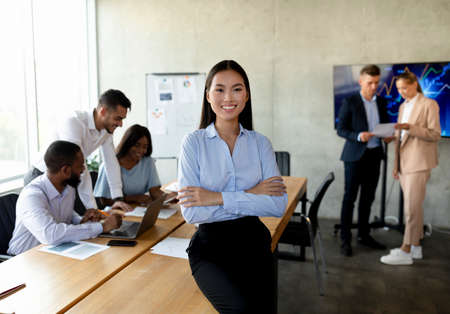 young asian businesswoman, standing in front of her team. arms crossed, smiling, looking at camera. eye contact