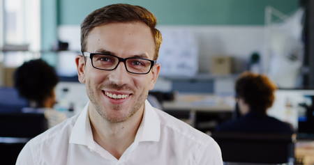 Close up of Caucasian handsome man in white shirt in glasses looking straight in the camera and smiling cheerfully. The blurred office background. Portrait. Indoors