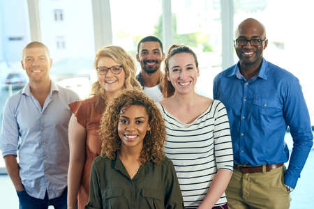 Diverse group of adult people looking at camera and smiling while wearing business casual outfits