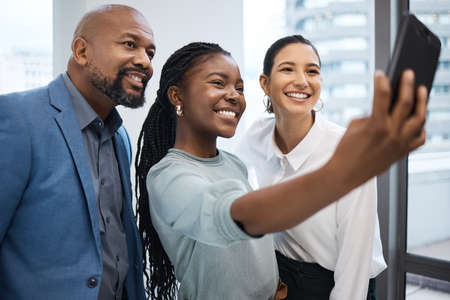 Snaps of success. a group of businesspeople taking selfies together in an office.