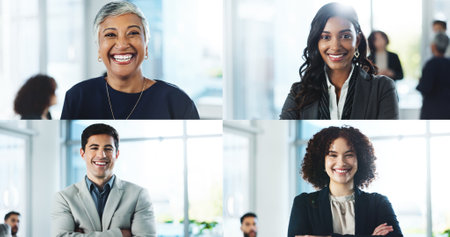 Portrait, collage and employees with smile, office and confident for job promotion or positive mindset. Corporate, happy and business people with ambition for career growth and opportunity in company